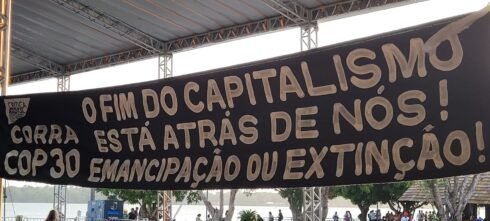 Uma das faixas coloca o capitalismo em xeque, falando abertamente e questionando o sistema social e econômico, que precisa mudar radicalmente ou ser extinto: “Corra COP 30: O fim do capitalismo está atrás de nós! Emancipação ou extinção!”