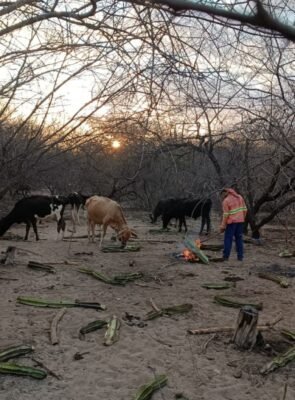A fumaça sinaliza a lavareda que consume os espinhos do mandacaru. Os homens arrastam os galhos sapecados para o campo limpo, a fim de separar do miolo os tecidos remanescentes desse cacto que é a última fronteira entre a sobrevivência e a morte do rebanho até a chuva voltar. O ronco da forrageira tritura a casca negra resultante da ação do fogo para, em seguida, ser lançada na cocheira para os animais, que já aguardam famintos. Registro do flagelo narrado por Rachel de Queiroz, em O quinze, e por Fontes Ibiapina, em Vida gemida em Sambambaia, repete-se em 2025.