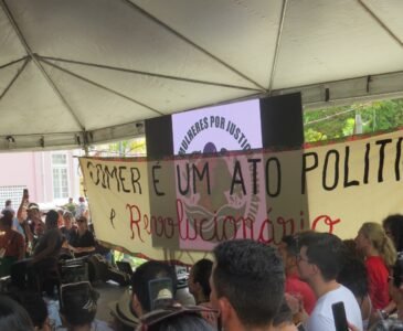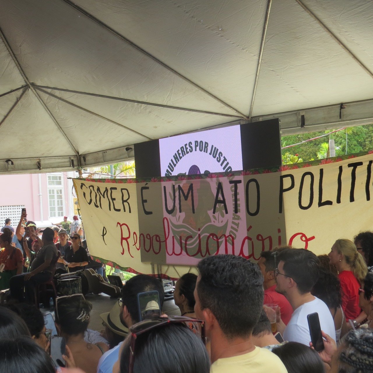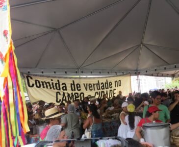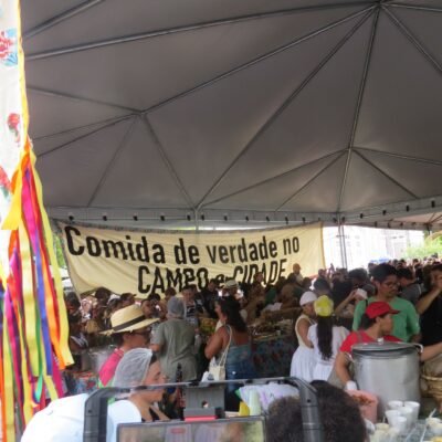 Na tenda armada especialmente para o almoço coletivo e para a apresentação musical, havia faixas que celebravam a importância da alimentação. “Comer é um ato político e revolucionário” era uma das mensagens. Outra faixa dizia: “Comida de verdade no campo e cidade”.