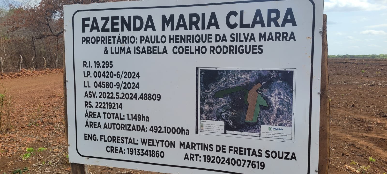 Segundo placa informativa colocada no local, a área está dentro dos domínios da Fazenda Maria Clara, latifúndio de 1.149 hectares, pertencente a Paulo Henrique da Silva Marra e Luma Isabela Coelho Rodrigues. A área desflorestada equivale a 688 campos de futebol.