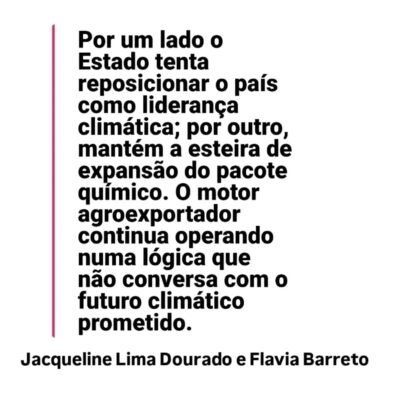 Só que o Brasil tem o hábito de produzir um contraplano no mesmo take. Enquanto Belém projetava futuro, Brasília seguia assinando presente velho. Durante a própria COP30, o Ministério da Agricultura registrou 30 novos agrotóxicos. E 2025 abriu em ritmo igualmente acelerado, com 73 novos insumos liberados, 44 deles agrotóxicos químicos e 29 bioinsumos. O retrato do modelo dominante fica claro: por um lado o Estado tenta reposicionar o país como liderança climática; por outro, mantém a esteira de expansão do pacote químico. Os números não precisam de adjetivo. Eles já dizem, sozinhos, que o motor agroexportador continua operando numa lógica que não conversa com o futuro climático prometido.